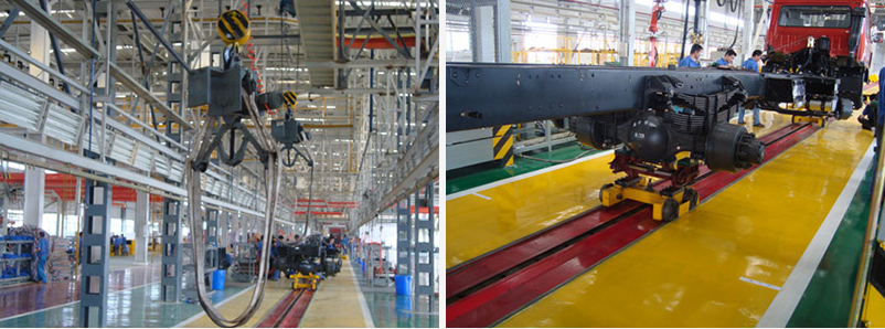 該項目由總裝配線和車身分裝線組成。總裝配線用于整車底盤裝配及檢查下線,它由兩部分組成,前部分采用單鏈牽引小車形式,即可調(diào)臺車間距垂直返回式地拖鏈,后部分采用雙板鏈形式。總裝線產(chǎn)品上線為起吊設(shè)備吊裝上線,產(chǎn)品下線為駕駛員駕駛產(chǎn)品下線。產(chǎn)品在總裝配線上由兩臺至四臺臺車支撐運(yùn)行,完成駕駛室、輪胎、車廂等的裝配作業(yè)。為了使產(chǎn)品在雙行道板鏈和地拖鏈之間自動平滑過渡,在地拖鏈的末端與雙行道板鏈重疊段設(shè)置向下的緩坡。
