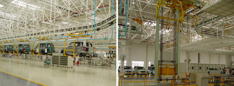 該系統(tǒng)主要由以下三部分組成:漆后車身輸送線、內(nèi)裝飾線、底盤線。漆后車身輸送線主要用于將涂裝好的車身儲存及轉(zhuǎn)運,線體采用滑撬輸送機,涂裝車間的旋轉(zhuǎn)滾床將編組后的漆后車身送入過廊上的雙鏈輸送機。車身在過廊上儲存和輸送,在轉(zhuǎn)掛滾床上定位,經(jīng)液壓舉升叉式移栽機將車身轉(zhuǎn)移到旋轉(zhuǎn)滾床上,在通過叉式移栽升降機將車身落到內(nèi)裝飾線的隨動裝置上。內(nèi)裝飾線采用版式輸送機,從漆后車身輸送線通過隨動裝置接漆后車身,再將內(nèi)飾后的車身送到底盤線。底盤線包括:底盤裝配線、車門分裝線、車輪分裝線、儀表臺分裝線、前懸分裝線、后懸分裝線、發(fā)動機分裝線、座椅分裝線、最終裝配線等。控制系統(tǒng)采用五套分控制系統(tǒng),系統(tǒng)一控制漆后車身輸送線及內(nèi)實現(xiàn)轉(zhuǎn)接升降設(shè)備;系統(tǒng)二控制內(nèi)飾車門線及儀表分裝線;系統(tǒng)三控制底盤、輪胎、座椅線、發(fā)動機和前后懸分裝線;系統(tǒng)四控制最終裝配線、車身轉(zhuǎn)運及OK線;系統(tǒng)五控制外觀檢測線。