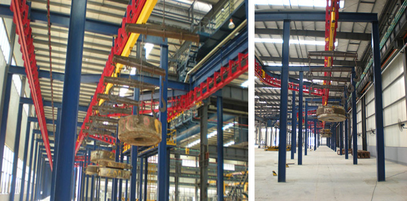 該輸送系統(tǒng)用于塔機(jī)結(jié)構(gòu)件的涂裝生產(chǎn)線,承擔(dān)涂裝工件的輸送,是全天候作業(yè)的工作場所。輸送的主要構(gòu)件有:塔身、塔頂、標(biāo)準(zhǔn)節(jié)、平衡臂、起重臂。工件外形尺寸:結(jié)構(gòu)件12000×2800×2800mm;重量:單掛6000kg、雙掛12000kg;生產(chǎn)綱領(lǐng):兩班制,年產(chǎn)3000臺(tái)套。系統(tǒng)采用公司新開發(fā)的重型積放式懸掛輸送機(jī),該機(jī)具有載重量大,工作效率高等特點(diǎn)。