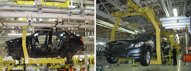 本項目是在北京奔馳現有的克萊斯勒汽車總裝車間整合設備,生產奔馳E級車和C級車。在地面高度新安裝ASD輸送線。使用空滑撬升降機將車身降到地面高度??栈怂腿霛L床,在0m時,通過鏈式移行機輸送到北側新的ASD輸送線。再通過移行機、滾床和升降機,把車身送入+3.3米的C型吊具中。車身在總裝滑撬上,完成操作后,車身向左或向右進入橫移保護工位(速度12min/min)。為了適應兩種車型的自動轉換。在線安裝支點自動轉換裝置,按照不同車型進行轉換。在底盤吊具和橇體上車身轉掛工位,設置舉升臺和浮動裝置,并經定位裝置進行準確定位,保證轉掛的準確性。車門線為了適應新車型,對所有支撐和安裝結構進行改造更新,保證車門線適應新車型的需要。