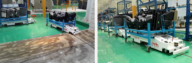 云南力帆駿馬車輛有限公司主要生產輕卡和重卡整機生產,該AGV項目用于總裝車間線邊物料的配送以及空料車回收,滿足生產線40JPH節拍。AGV采用磁道航導引系統,并通過控制系統與其他管理系統即時通訊,可實現無人自動化運輸,是汽車行業等提升行業競爭力、減少人工成本、提高倉配效率的選擇。